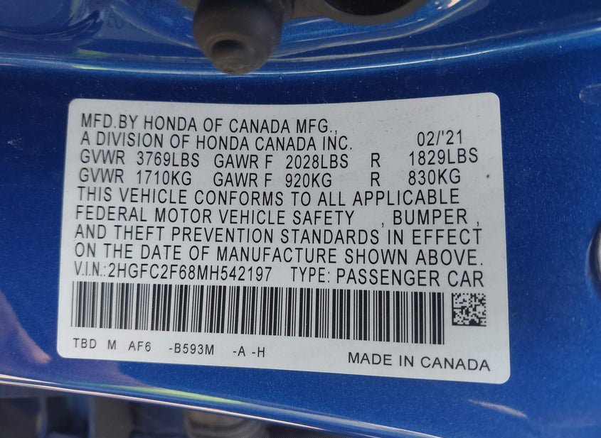 - VIN: 2HGFC2F68MH542197