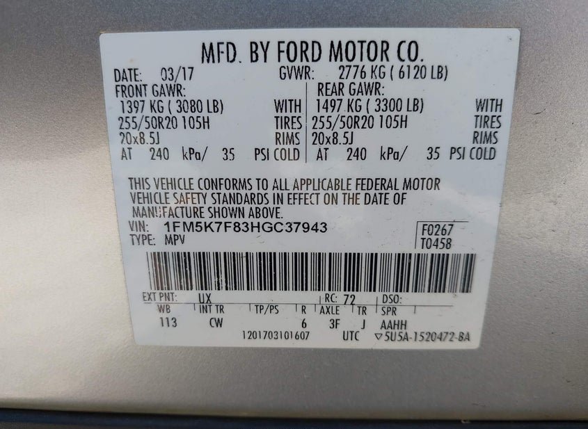- VIN: 1FM5K7F83HGC37943