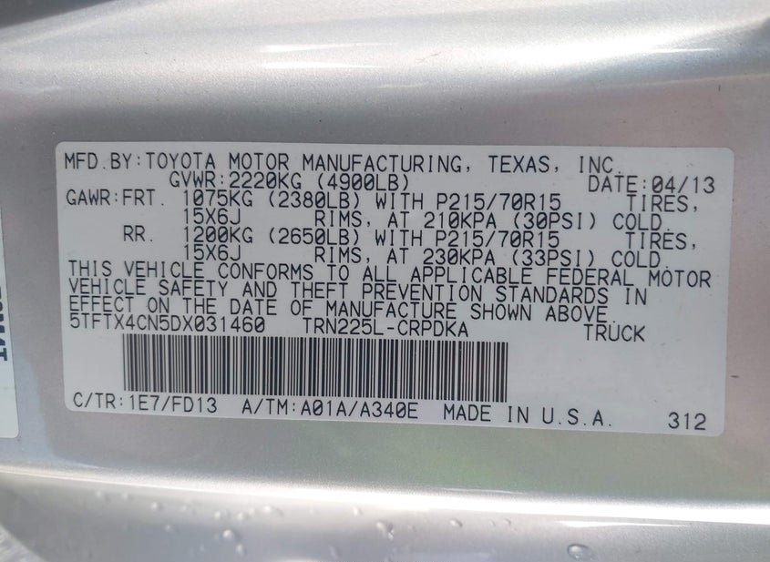 - VIN: 5TFTX4CN5DX031460