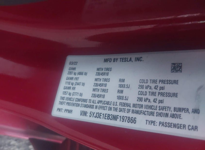 - VIN: 5YJ3E1EB3NF197866