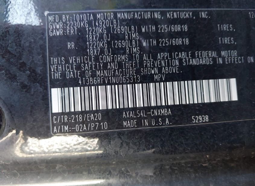 - VIN: 4T3B6RFV1NU065313
