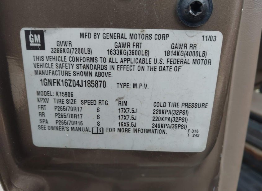 - VIN: 1GNFK16Z04J185870