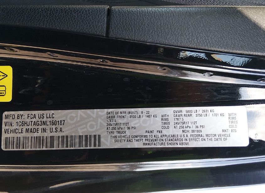 - VIN: 1C6HJTAG3NL160187