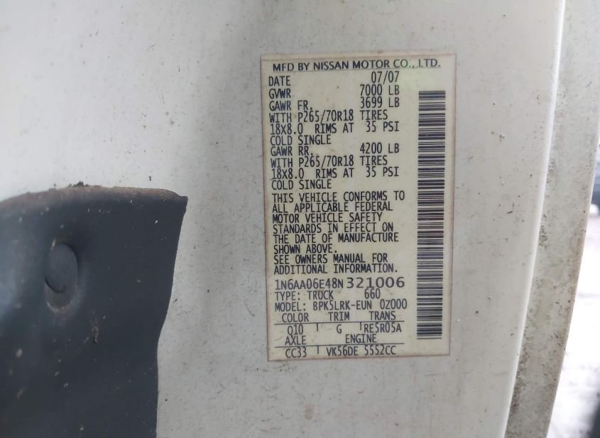 - Название лота: 2008 NISSAN TITAN XE