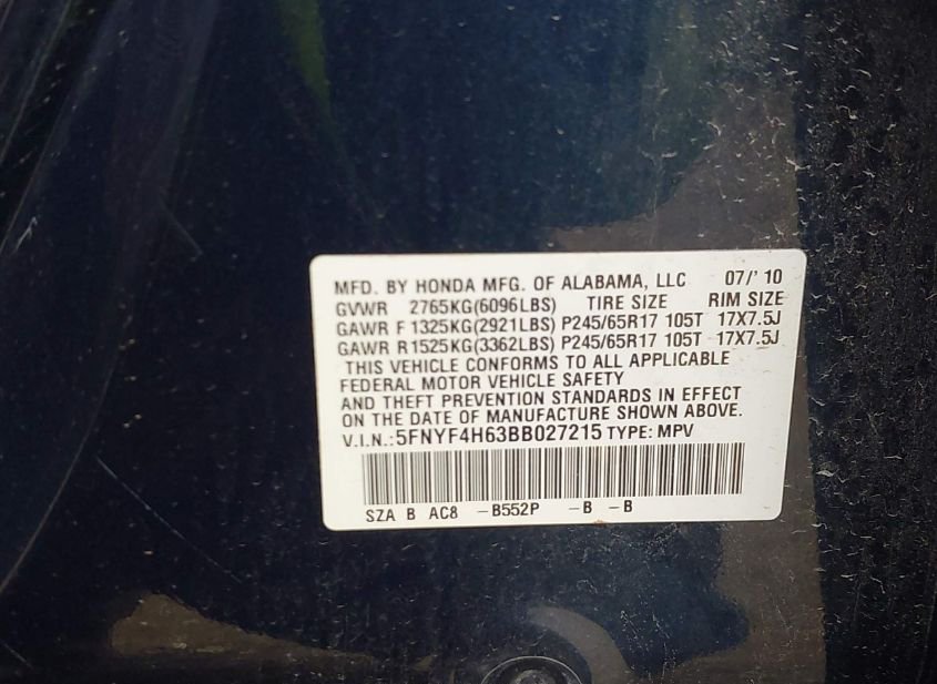 - VIN: 5FNYF4H63BB027215