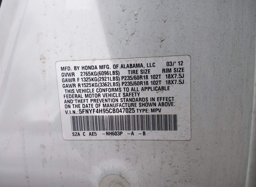 - VIN: 5FNYF4H95CB047025