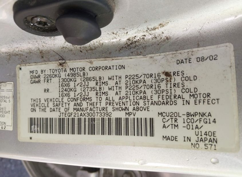 - VIN: JTEGF21AX30073392