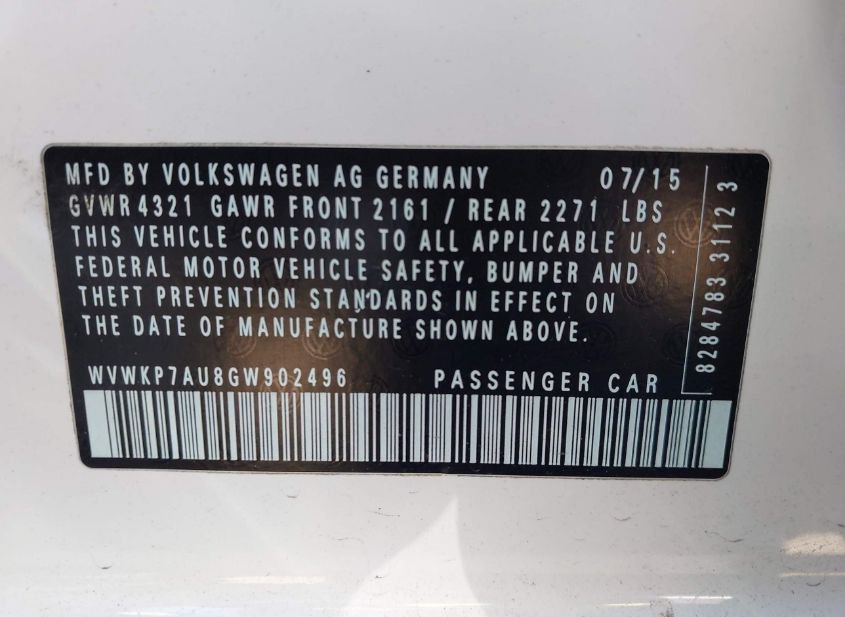 - VIN: WVWKP7AU8GW902496