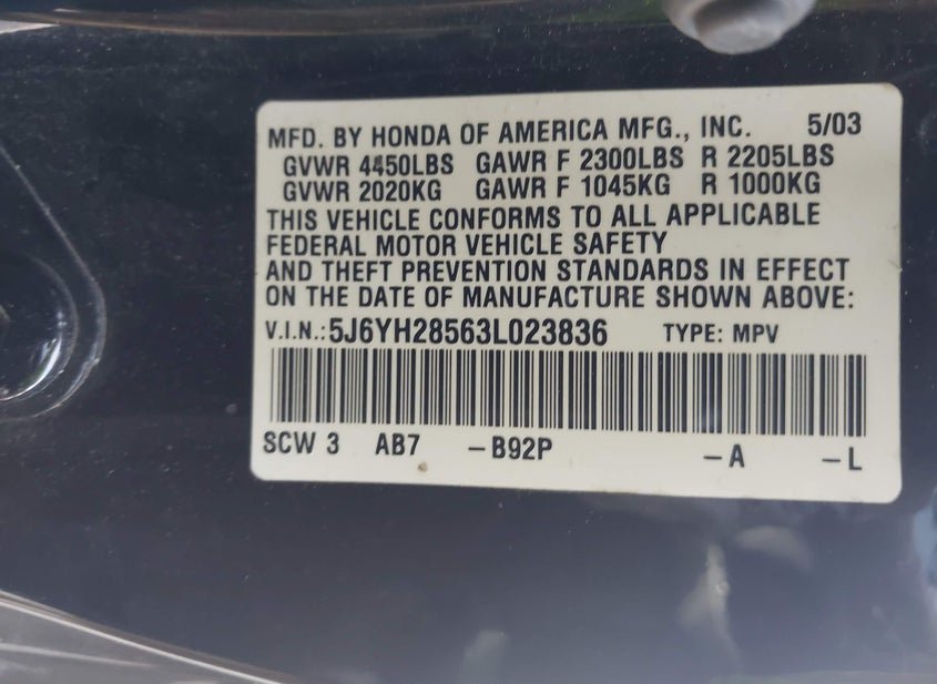 - VIN: 5J6YH28563L023836