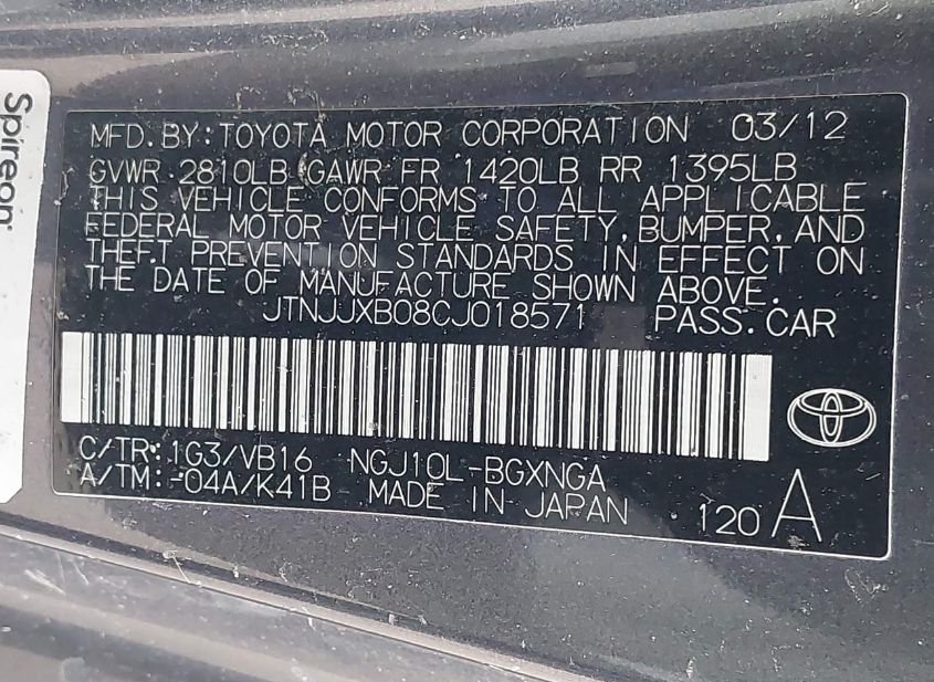 - VIN: JTNJJXB08CJ018571