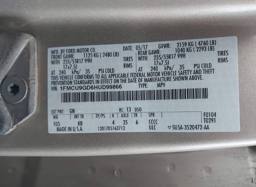 - VIN: 1FMCU9GD6HUD99866
