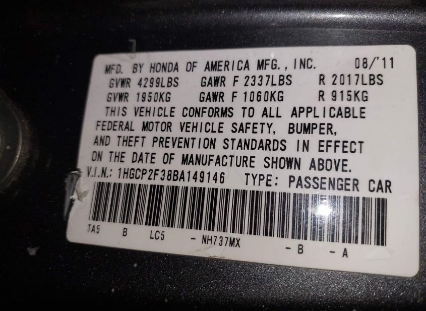 - VIN: 1HGCP2F38BA149146