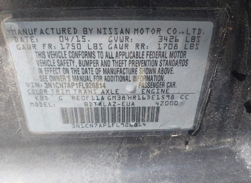 - VIN: 3N1CN7AP1FL926814
