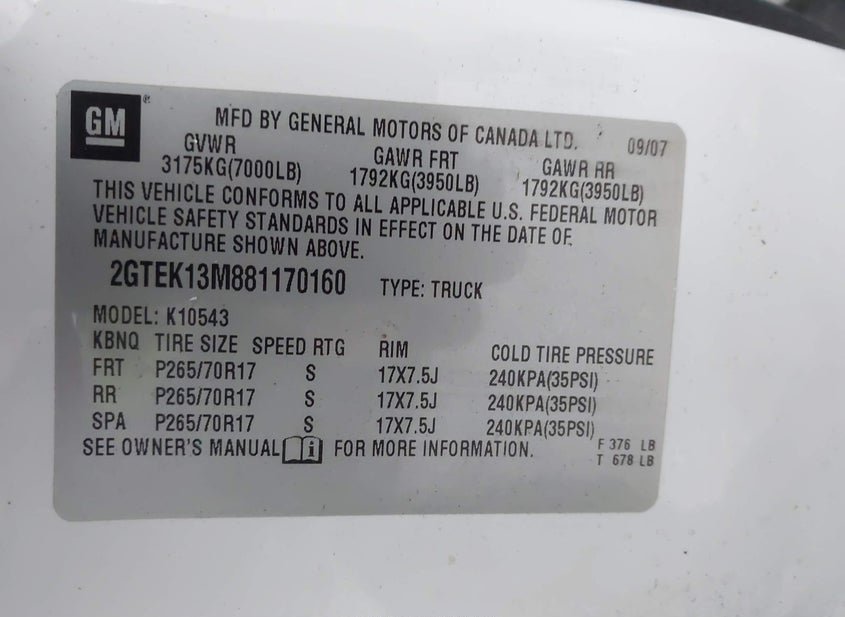 - VIN: 2GTEK13M881170160