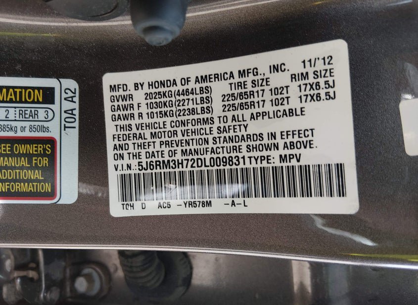 - VIN: 5J6RM3H72DL009831