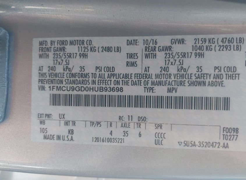 - VIN: 1FMCU9GD0HUB93698