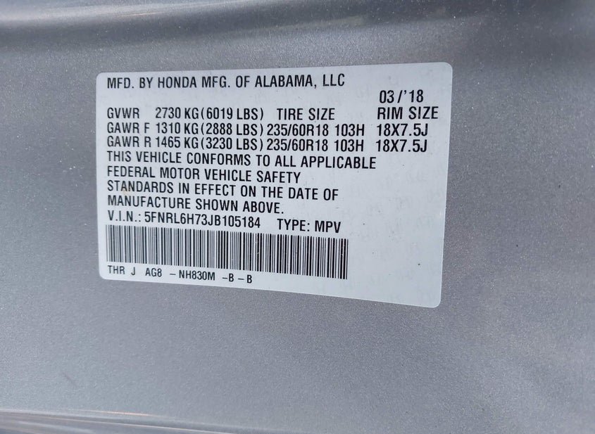 - VIN: 5FNRL6H73JB105184
