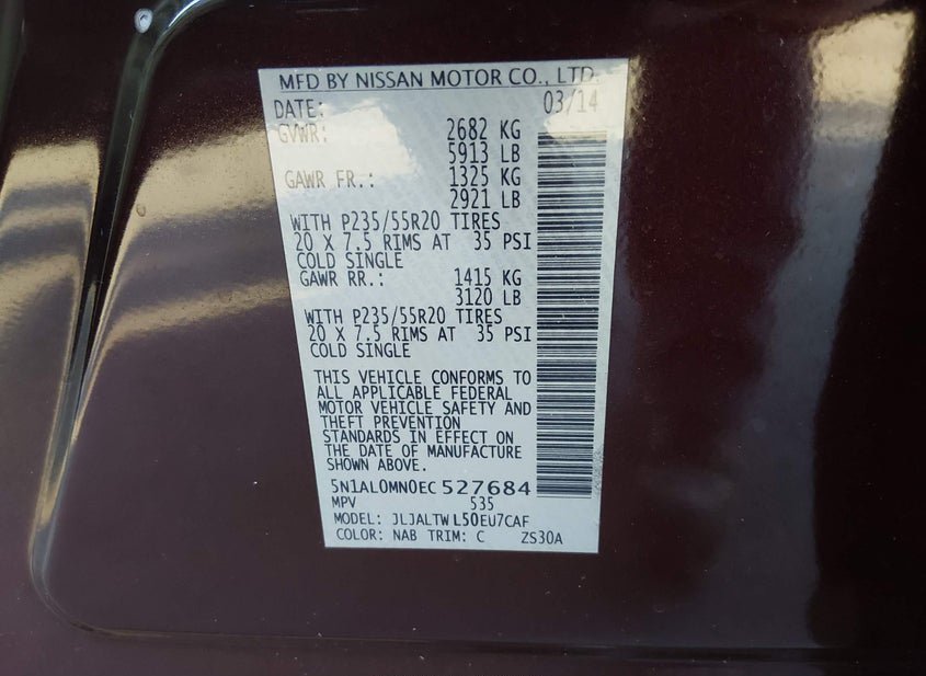 - VIN: 5N1AL0MN0EC527684