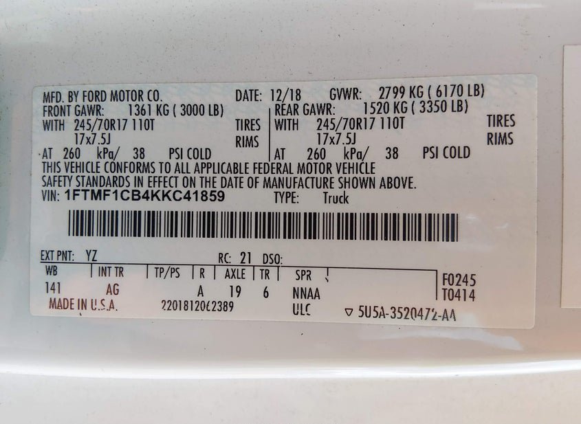 - VIN: 1FTMF1CB4KKC41859