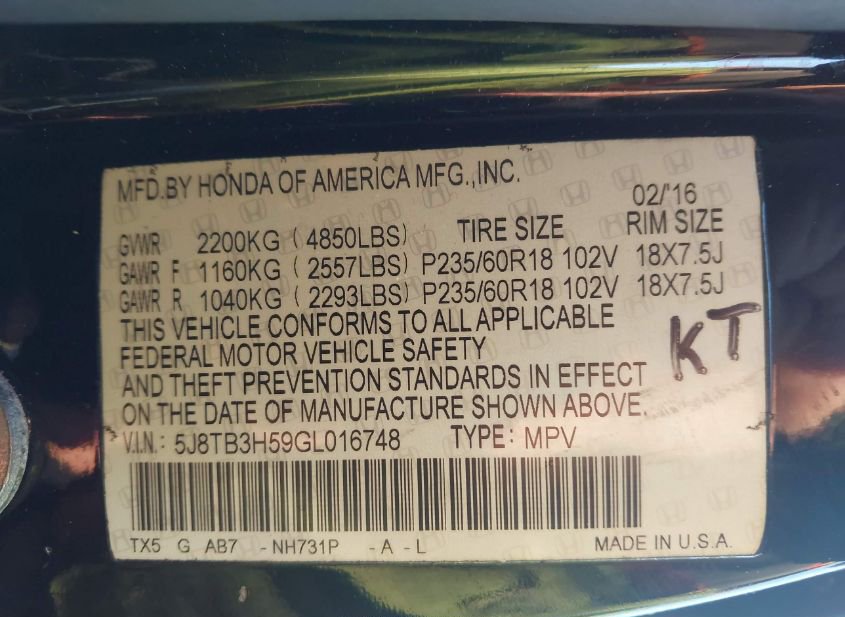 - VIN: 5J8TB3H59GL016748