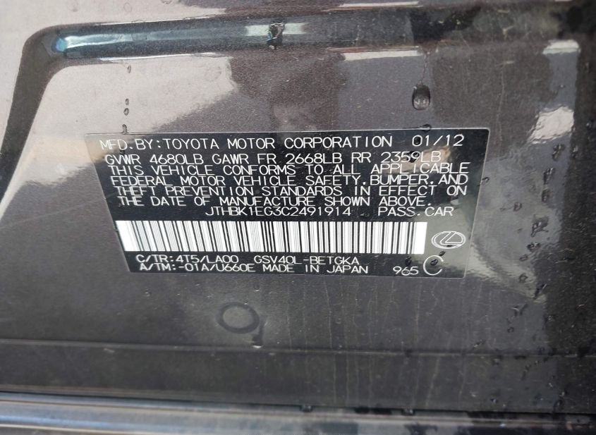 - Название лота: 2012 LEXUS ES 350