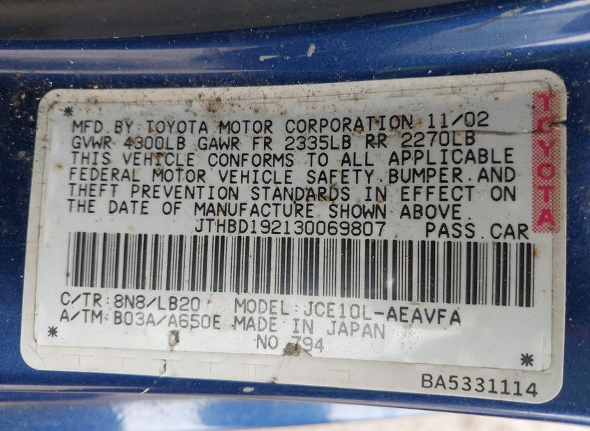 - VIN: JTHBD192130069807
