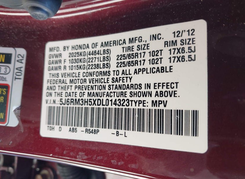 - VIN: 5J6RM3H5XDL014323