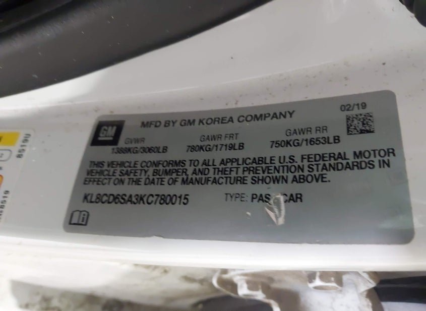 - VIN: KL8CD6SA3KC780015
