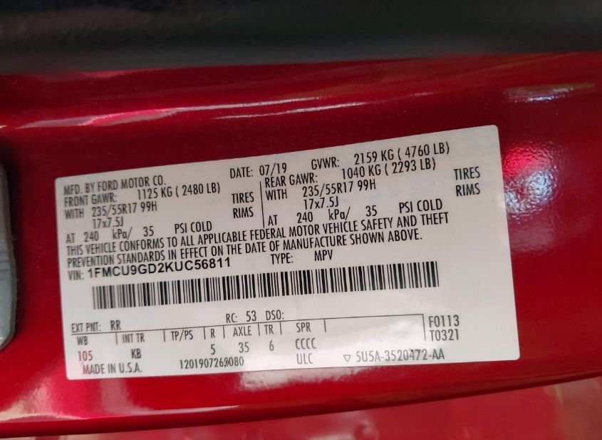 - VIN: 1FMCU9GD2KUC56811