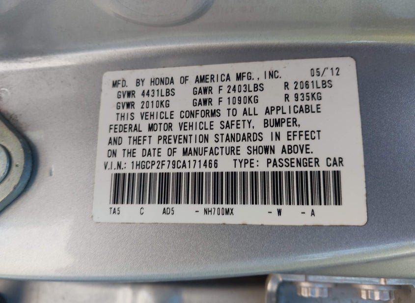 - VIN: 1HGCP2F79CA171466