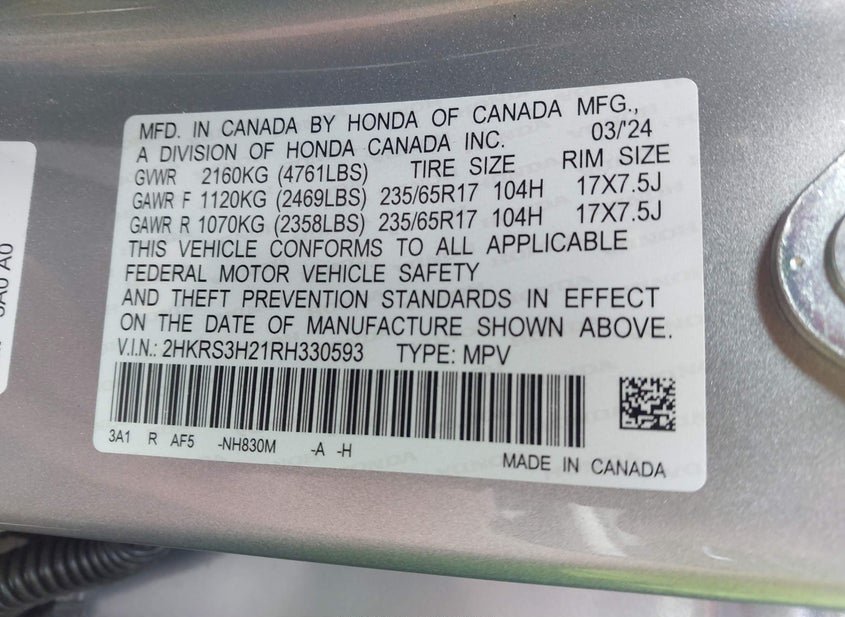 - VIN: 2HKRS3H21RH330593