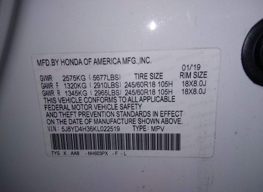 - VIN: 5J8YD4H36KL022519