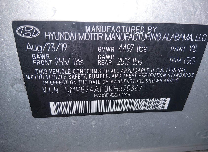 - VIN: 5NPE24AF0KH820367