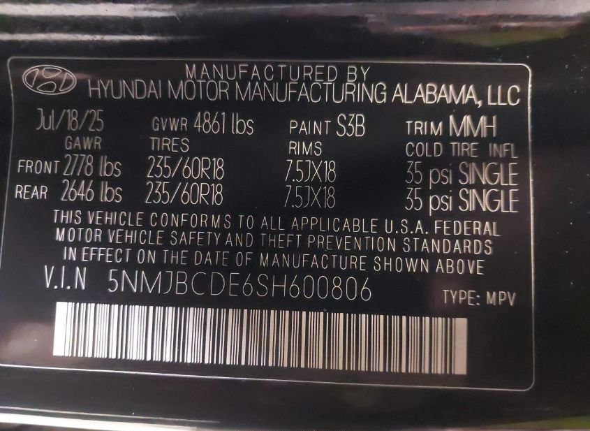 - VIN: 5NMJBCDE6SH600806
