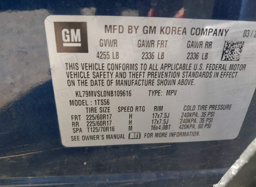 - VIN: KL79MVSL0NB109616