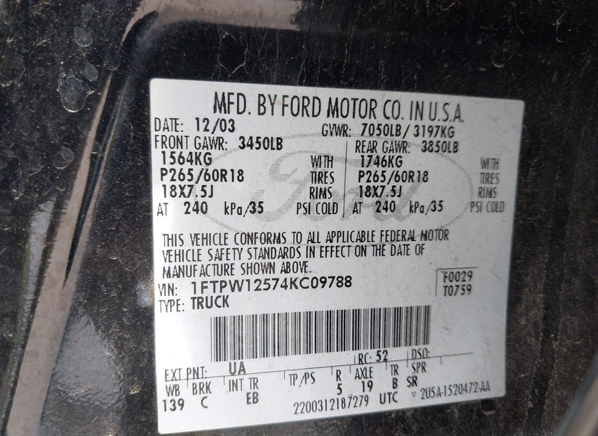- VIN: 1FTPW12574KC09788