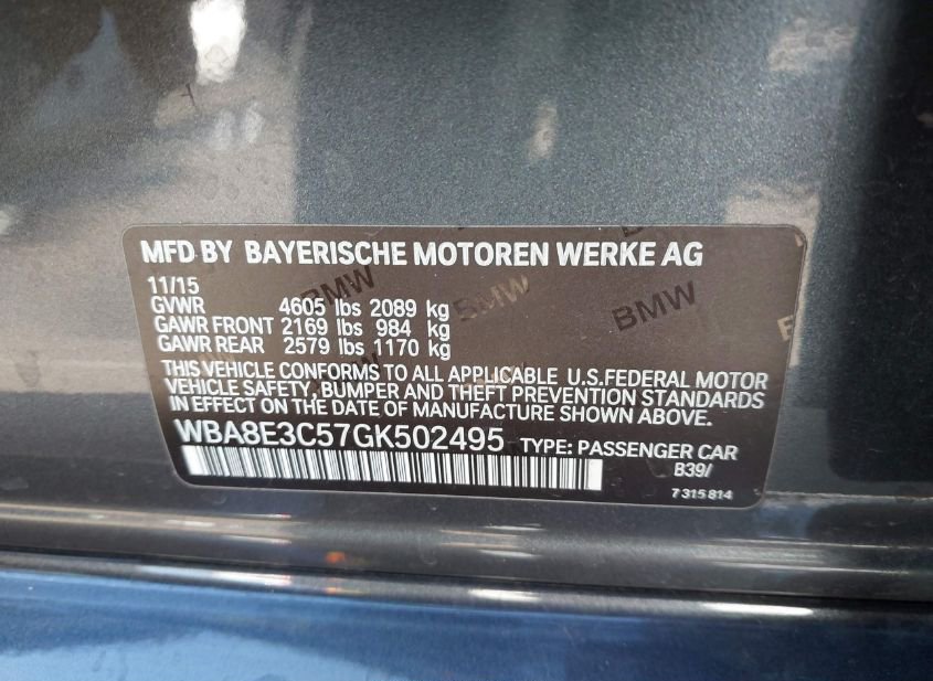 - VIN: WBA8E3C57GK502495