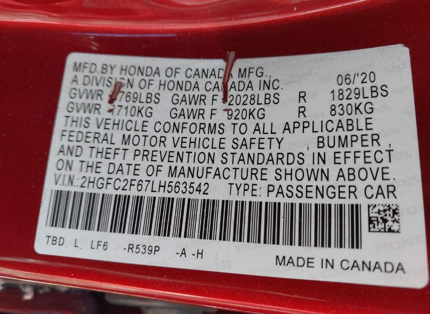 - VIN: 2HGFC2F67LH563542