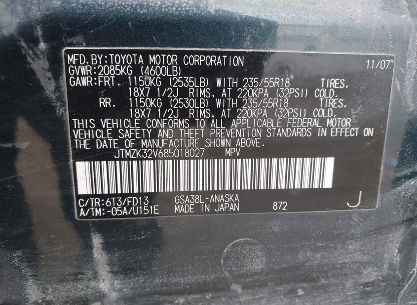 - VIN: JTMZK32V685018027