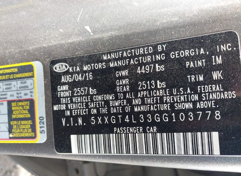 - VIN: 5XXGT4L33GG103778