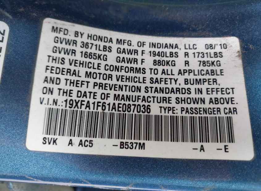 - VIN: 19XFA1F61AE087036