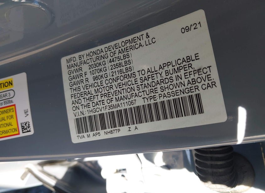 - VIN: 1HGCV1F35MA111067