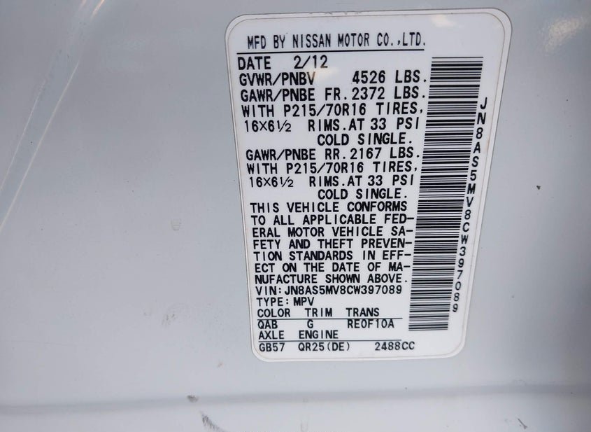 - VIN: JN8AS5MV8CW397089