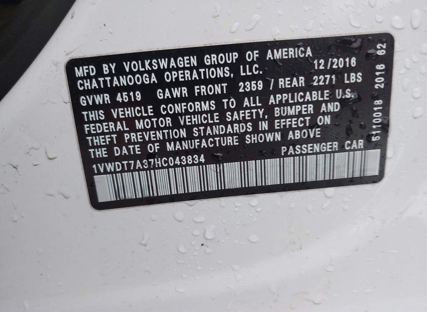 - VIN: 1VWDT7A37HC043834