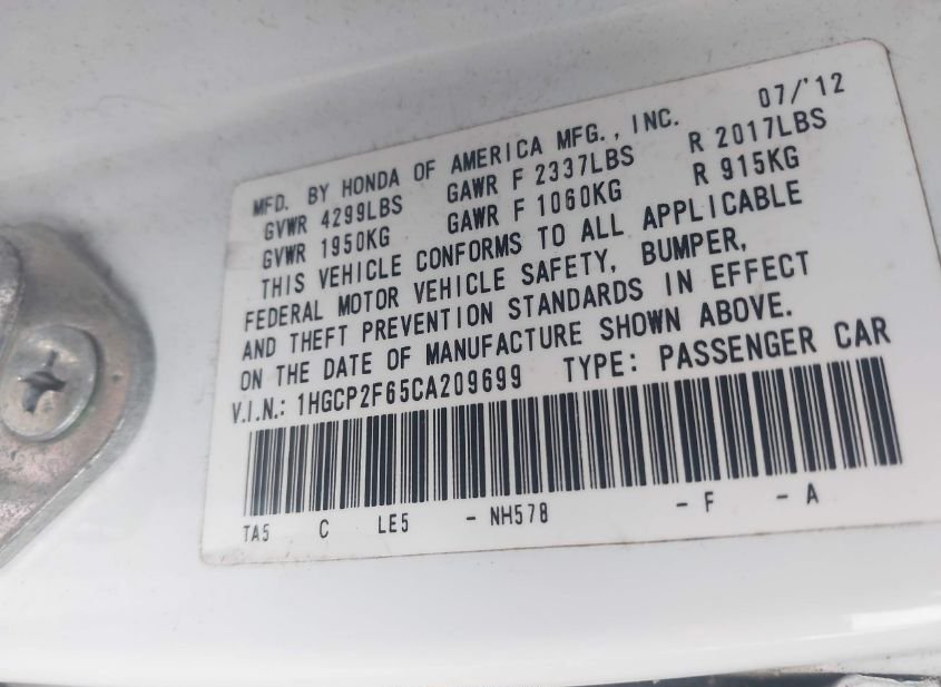 - VIN: 1HGCP2F65CA209699