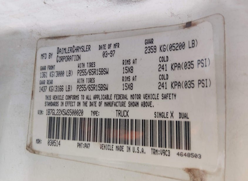 - VIN: 1B7GL22X5WS500020