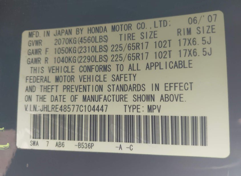 - VIN: JHLRE48577C104447