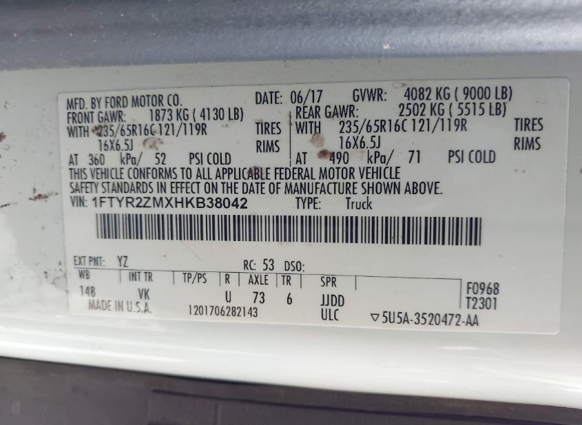- VIN: 1FTYR2ZMXHKB38042