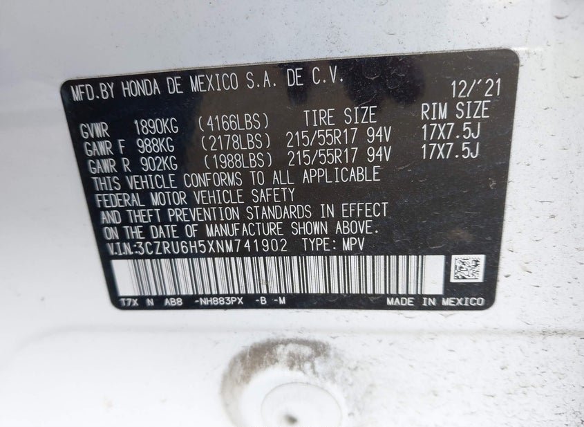 - VIN: 3CZRU6H5XNM741902