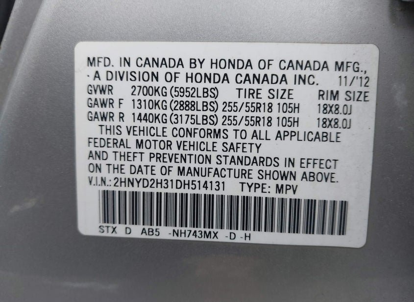 - VIN: 2HNYD2H31DH514131